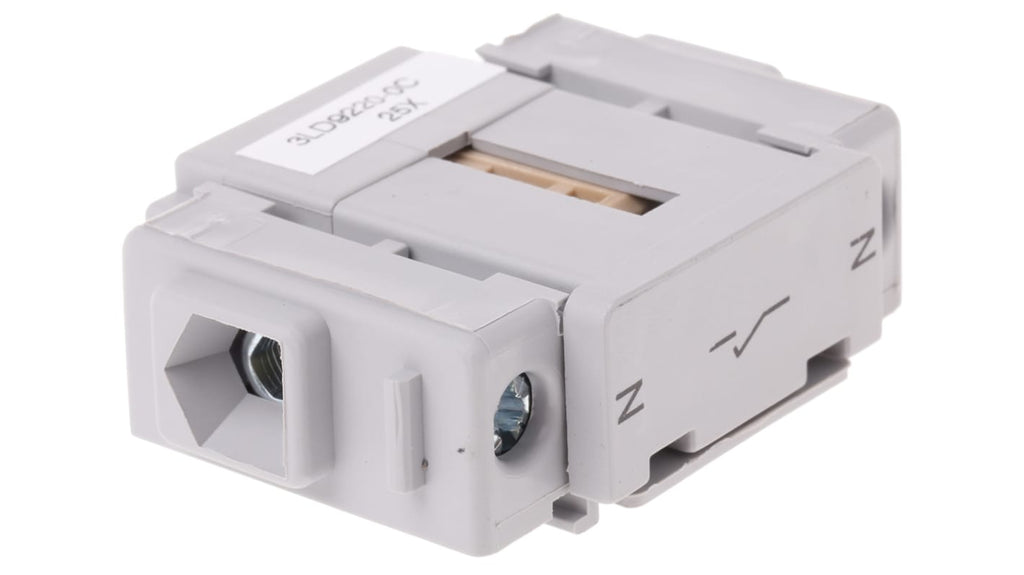 Blocco contatti per elementi di commutazione, 1NO, compatibile con la serie 3LD2. Fissaggio anteriore e a parete, installabile a sinistra e/o a destra. Include interruttore ausiliario, organo di contatto utilizzabile per conduttore N, anticipo accensione e ritardo spegnimento. Certificato CE.