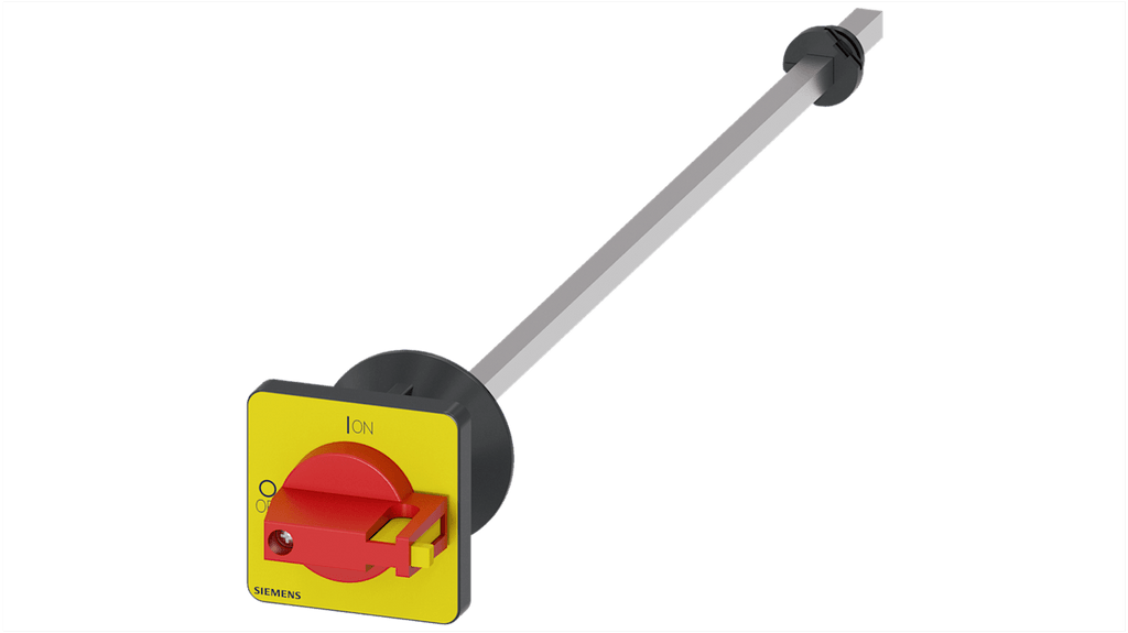 Meccanismo di azionamento rotante per accoppiamento porta. Colore giallo, dimensioni 48x48 mm, montaggio su piastra frontale e foro centrale di 22,5 mm. Lunghezza dell'albero 300 mm. Compatibile con la serie 3LD3. Approvazione EAC e CE.