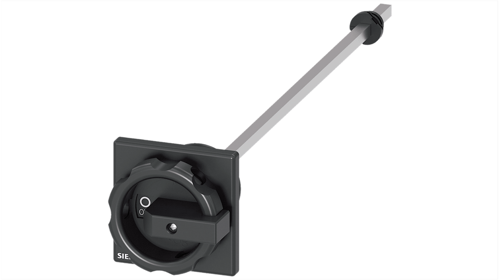 Meccanismo di azionamento rotante per accoppiamento porta. Colore nero, dimensioni 66x66 mm, montaggio su piastra frontale con foro centrale di 22,5 mm, lunghezza dell'albero 300 mm. Compatibile con la serie 3LD3. Approvazione EAC.