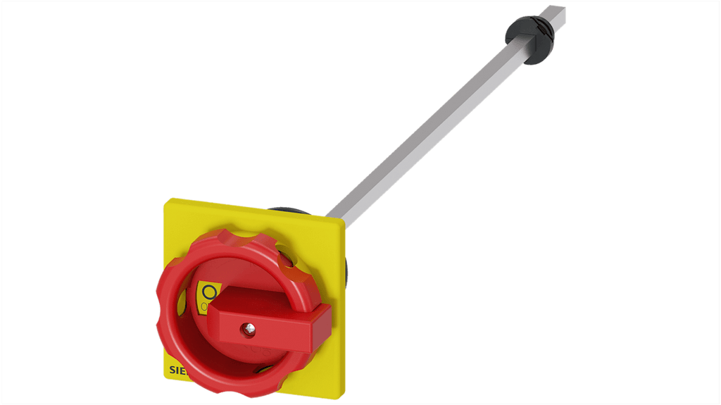 Meccanismo di azionamento rotante per accoppiamento porta. Colore rosso e giallo, montaggio su piastra frontale 66x66 mm, foro centrale di 22,5 mm, lunghezza dell'albero 300 mm. Compatibile con la serie 3LD3. Approvazione EAC e CE.