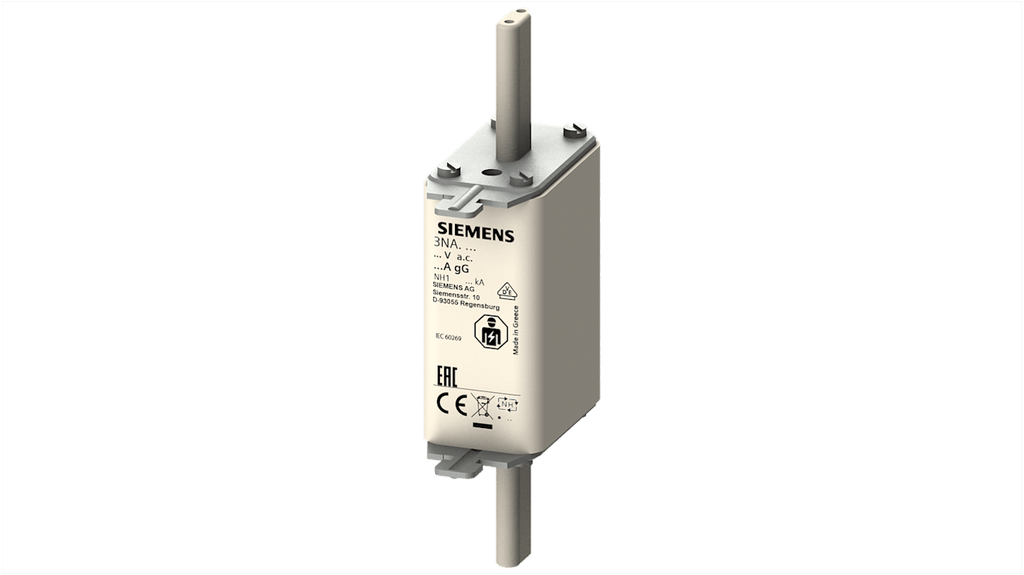 Fusibile con linguette centrate, Siemens, 40A, fusibile NH1, categoria gG, tensione nominale 500V. Prodotto per sistemi di distribuzione elettrica, adatto per impianti industriali e quadri elettrici. Codice costruttore 3NA3117.