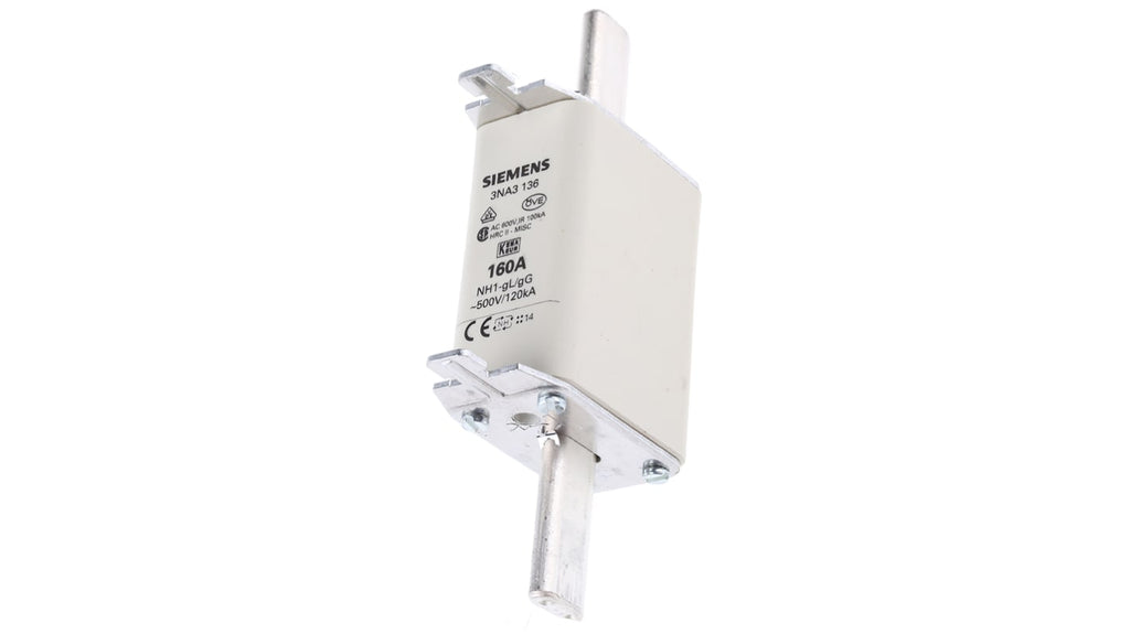 Fusibile NH, 160A, tipo gG, misura NH1, tensione nominale 500V ca, standard CSA 22.2, IEC EN 60269, VDE 0636. Dotato di indicatore di fusibile bruciato, corpo in ceramica resistente, contatti esterni anticorrosione. Lunghezza complessiva 137mm, lunghezza corpo 75mm, spessore corpo 30mm. Elevata capacità di rottura, progettato per protezione di cavi e linee in ambito industriale e di fornitura di energia elettrica. Codice costruttore 3NA3136.