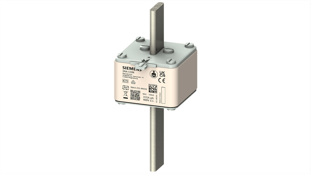 Fusibile con linguette, Siemens, 100A, dimensioni 149 x 72 x 62mm, tensione nominale 400V, standard EN 60269-1, collegamento fusibile LV HRC con funzione di misurazione, indicatore di identificazione frontale, comunicazione wireless, montaggio preferibilmente verticale, contatto di commutazione non corrosivo. Codice costruttore 3NA3230-4KK04.