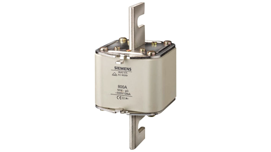 Fusibile NH Siemens, 800A, per protezione di impianti industriali e commerciali, classe di funzionamento NH4, tensione nominale 400 - 500V ca/cc, attacchi sotto tensione, pin di contatto placcati in argento, indicatore anteriore, progettato per funzionamento da parte di esperti, codice costruttore 3NA3475.