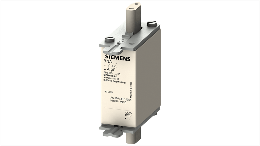 Fusibile con linguette centrate, Siemens, 2A, NH000, 690V, standard IEC 60269, categoria gG. Elevata capacità di interruzione 120kA, indicatore frontale, alette di presa sotto tensione. Minore sollecitazione alle apparecchiature a valle, livello di selettività finemente classificato per uso ottimale delle sezioni trasversali dei cavi. Codice costruttore 3NA3802-6.