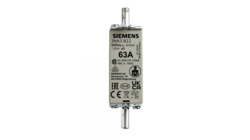 Fusibile NH Siemens, corrente nominale 63 A, tensione nominale 500 V c.a., dimensione fusibile NH000, categoria di applicazione gG, grado di protezione IP20, corpo in ceramica, contatti placcati in argento, indicatore di fusibile bruciato a molla, conforme a CSA 22.2, IEC EN 60269, VDE 0636, serie 3NA3, lunghezza 77.8 mm, spessore 21 mm, lunghezza corpo 49.7 mm.