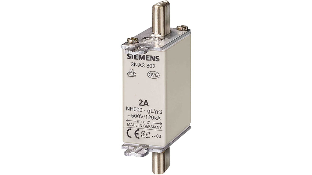 Fusibile NH000 con linguette centrate, Siemens, 125A, tensione nominale 400V ca, categoria gG, velocità F, contatto di commutazione placcato argento, anti-corrosione, montaggio verticale preferito, alette di presa sotto tensione, grado di protezione IP20 con conduttori collegati, lunghezza complessiva 77.8mm, lunghezza corpo 49.7mm, spessore corpo 21mm, design 3NA3.