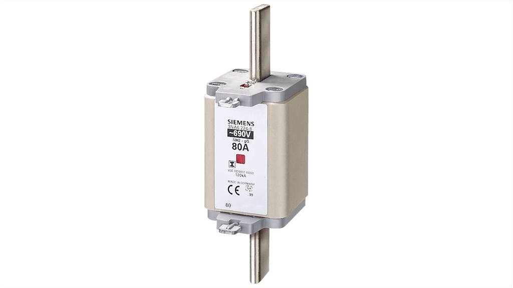 Fusibile con linguette centrate, Siemens, 250A, fusibile NH2, cat. gG 690V. Amperaggio 250A, dimensione fusibile NH2, tensione nominale 690V, categoria di applicazione gG. Prodotto della gamma Siemens Sentron, progettato per impianti industriali, centri dati e aeroporti. Utilizzato nei sistemi di distribuzione di aziende di alimentazione elettrica e quadri elettrici. Codice costruttore 3NA6244-6.