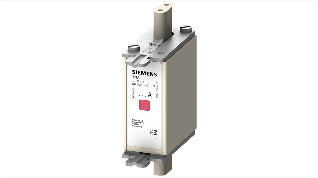 Fusibile con linguette centrate, Siemens, 4A, NH000, 690V, standard IEC 60269, categoria gG. Elevata capacità di interruzione 120kA, indicatori combinati, alette di presa sotto tensione. Minore sollecitazione alle apparecchiature a valle, livello di selettività finemente classificato per uso ottimale delle sezioni trasversali dei cavi. Codice costruttore 3NA7804-6.