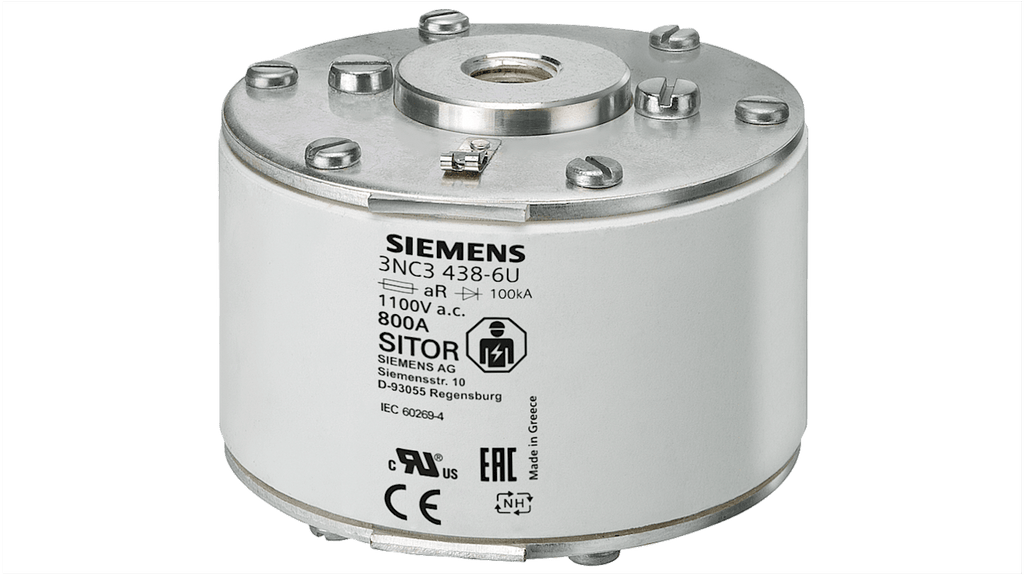 Fusibile quadrato Siemens, 500A, NH3, categoria aR, tensione nominale 440V. Prodotto della gamma Siemens Sentron, progettato per applicazioni industriali, centri dati e aeroporti. Caratteristiche di scollegamento ultra-rapido, ottima protezione per sistemi UPS e soft starter per motori. Codice costruttore 3NC3434-6U.