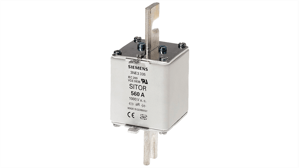 Fusibile con linguette ad asola, Siemens, 850A, fusibile NH3, cat. gR 690V. Amperaggio 850A, dimensione fusibile NH3, tensione nominale 690V, categoria di applicazione gR. Collegamento fusibile PV con contatti a lama piatta scanalata, scollegamento ultra-rapido, progettato per proteggere dispositivi come sistemi UPS e soft starter per motori.