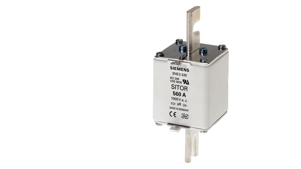 Fusibile NH per semiconduttori di potenza, Siemens, 560A, NH2, 1kV ac. Protezione rapida contro cortocircuiti, elevato fattore di carico variabile, alto livello di sicurezza operativa. Testato per dissipazione di calore e carico di corrente massimo. Codice costruttore: 3NE3335.