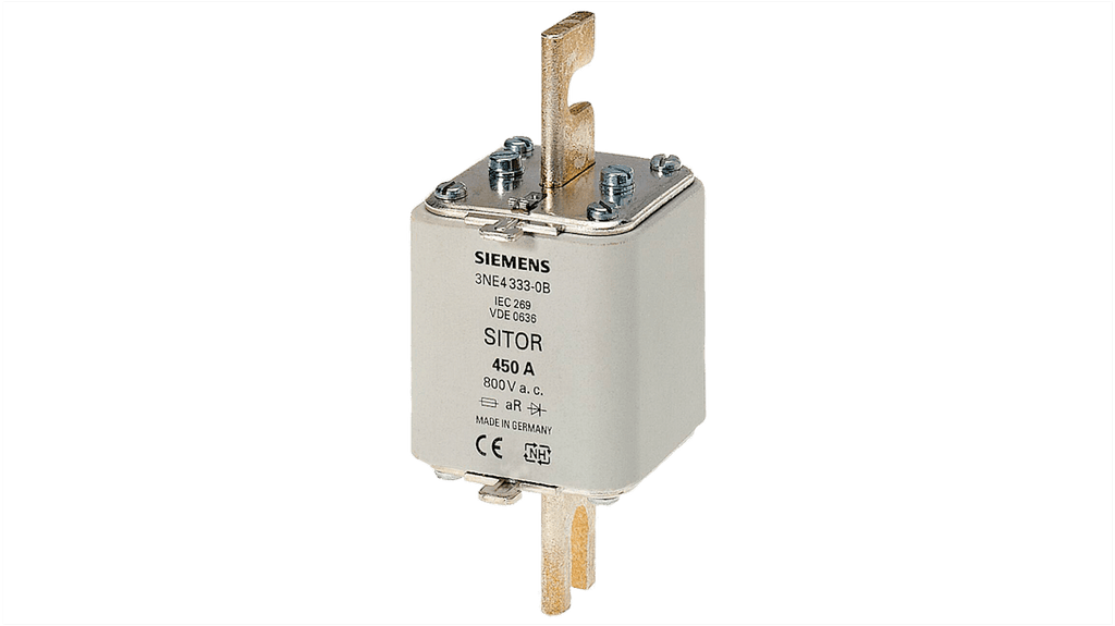 Fusibile NH2 conforme agli standard tedeschi, corrente di esercizio 250A, tensione nominale 800V, categoria di applicazione aR, elevata capacità di interruzione 100kA (c.a.), collegamento con contatti a lama piatta scanalata, indicatore frontale. Marchio Siemens, codice costruttore 3NE4327-0B.