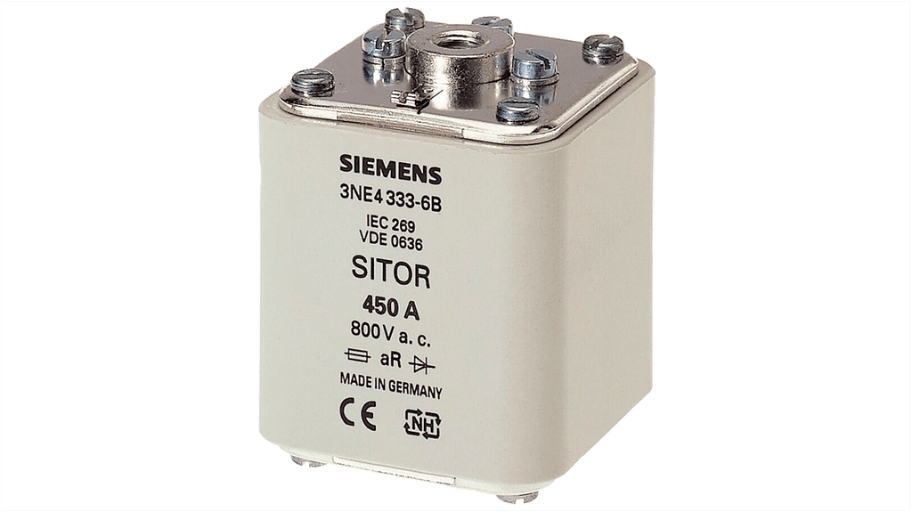 Fusibile quadrato con terminali a filo, corrente nominale 450A, tensione 800V, standard DIN EN 60269-1, categoria aR, elevata capacità di interruzione 100kA (c.a.), collegamento con filettatura femmina su entrambi i lati, indicatore frontale per attivazione sicura. Marchio Siemens, codice costruttore 3NE4333-6B.