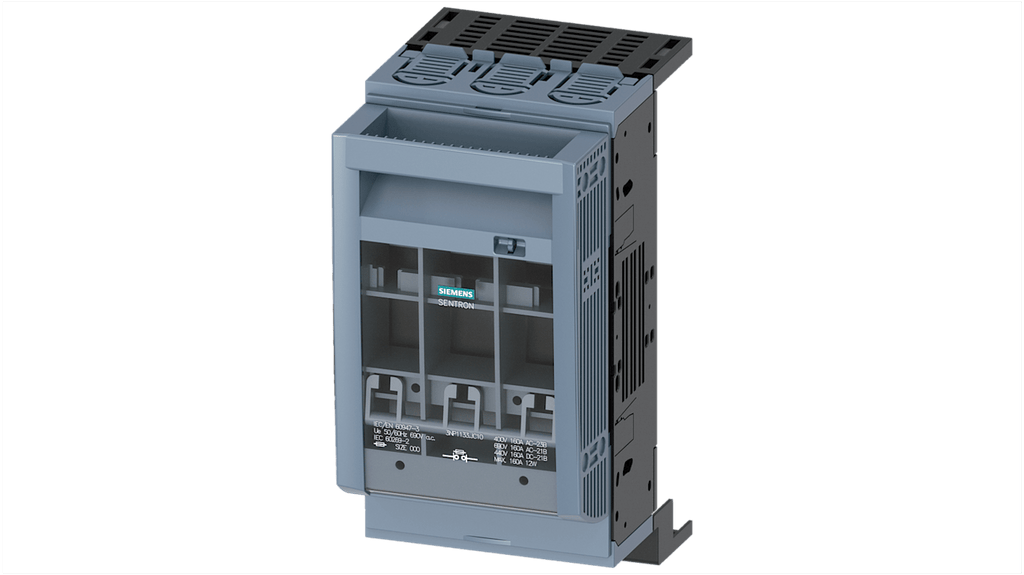 Sezionatore portafusibili Siemens con configurazione a 3 poli, corrente massima 160 A, fusibile NH00, serie 3NP1. Dimensioni: altezza 215,1 mm, larghezza 105,8 mm, profondità 134,5 mm. Metodo di fissaggio della barra di distribuzione. Prodotto progettato per garantire sicurezza ed efficienza nelle infrastrutture elettriche industriali.