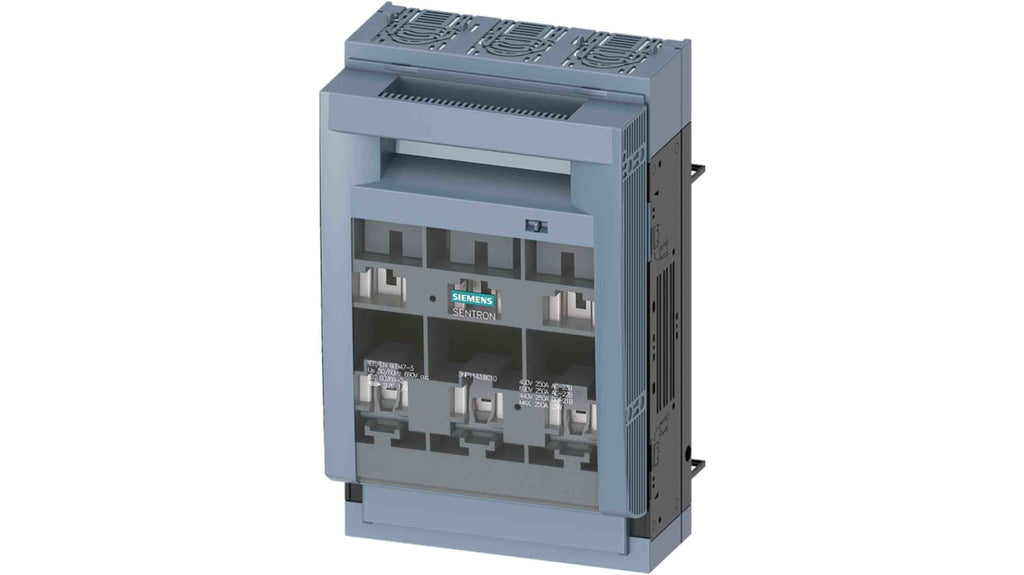 Sezionatore portafusibili Siemens con configurazione a 3 poli, corrente massima 250A, tensione d'esercizio 690V c.a., tensione di isolamento 1000V, resistenza alle sovratensioni 8kV, temperatura operativa da -25 a +55 gradi Celsius, dimensioni fusibile NH0, NH1, vita meccanica 1600 cicli. Collegamento elettrico a terminal piatto, serie SENTRON 3NP1.