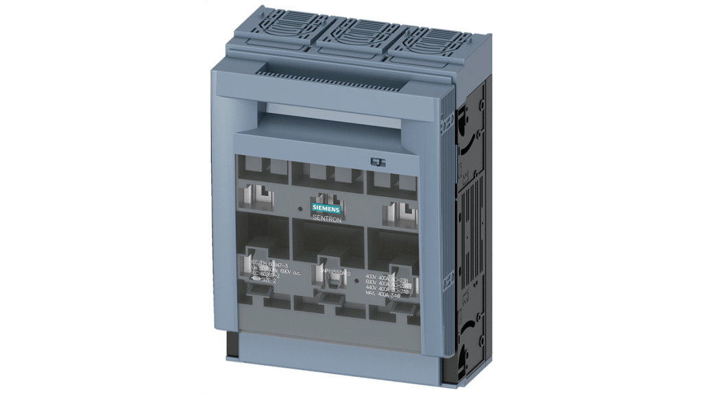 Sezionatore portafusibili Siemens Sentron, configurazione a 3 poli, corrente massima 400 A, fusibili NH1 e NH2, classe di protezione IP20, IP30, IP40, resistenza ai picchi di tensione 8 kV, temperatura operativa da -25 a +55 gradi, tensione di isolamento 1000 V, vita meccanica 1000 cicli. Progettato per garantire sicurezza e efficienza in applicazioni industriali.