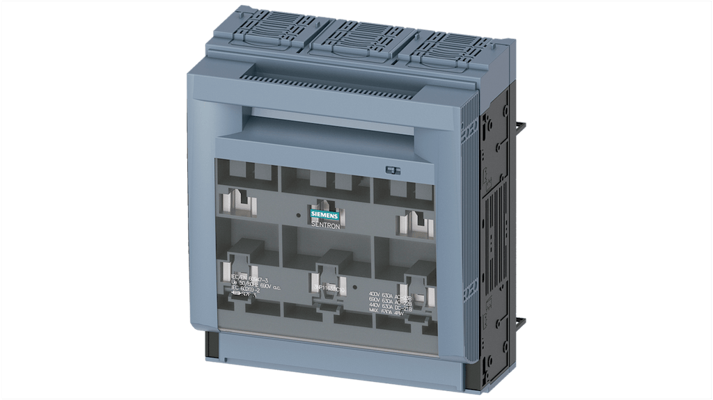 Sezionatore portafusibili Siemens con configurazione a 3 poli, corrente massima 630 A, fusibile NH3, serie 3NP1. Dimensioni: altezza 306 mm, larghezza 249,4 mm, profondità 164,5 mm. Metodo di fissaggio della barra di distribuzione. Prodotto per infrastrutture elettriche sicure ed efficienti.