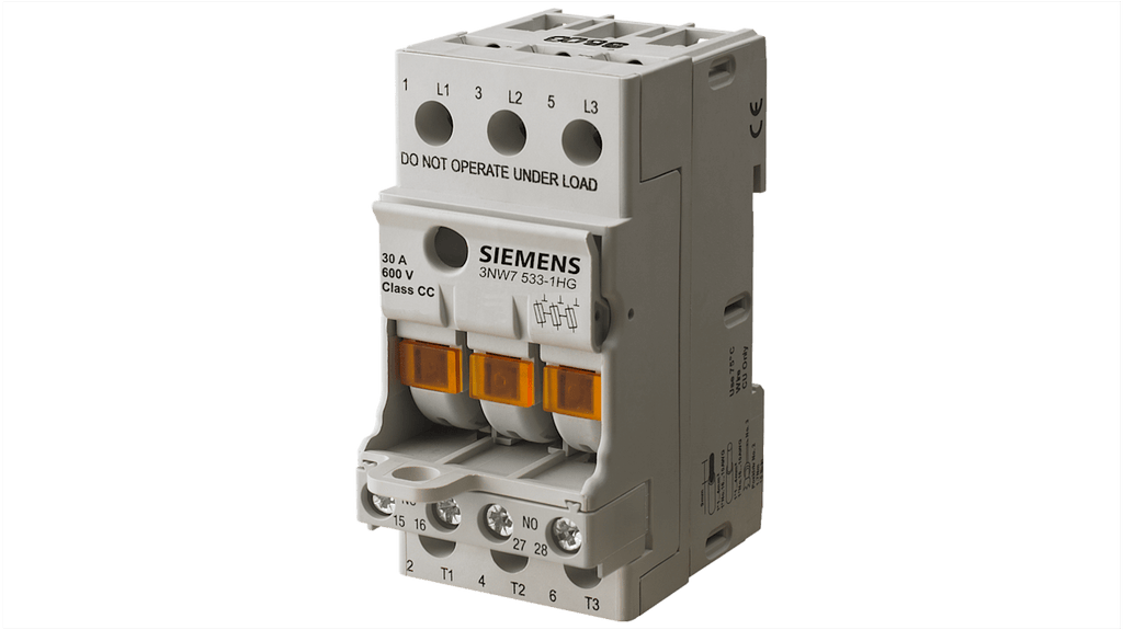 Contatto ausiliario Siemens, 2 contatti, 1NC/1NA, serie 3NW. Tensione nominale d'esercizio 250V, larghezza 9mm, altezza 83mm, profondità 64mm. Prodotto della serie Sentron, progettato per portafusibili compatti.