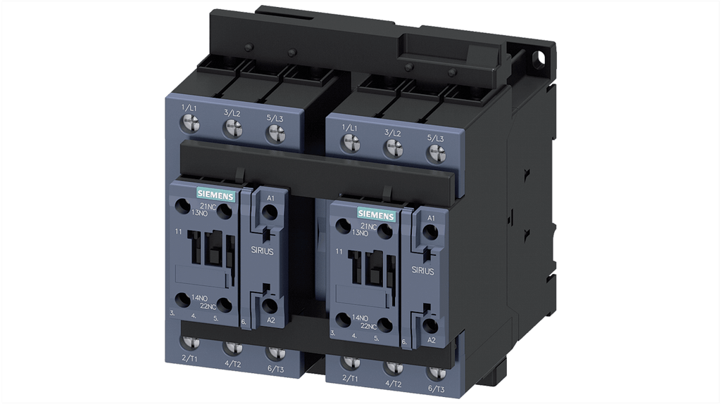 Teleinvertore Reversibile Siemens, 3 poli, 3 NA, 50 A, 22 kW, bobina 230 V c.a., montaggio a vite, interblocco meccanico ed elettrico, dimensione S2, classe di protezione IP20, approvato IEC e UL/CSA, predisposto per IE3/IE4, resistente al clima, configurazione reversibile, compatibile con motori di commutazione. Codice costruttore 3RA2336-8XB30-1AL2.