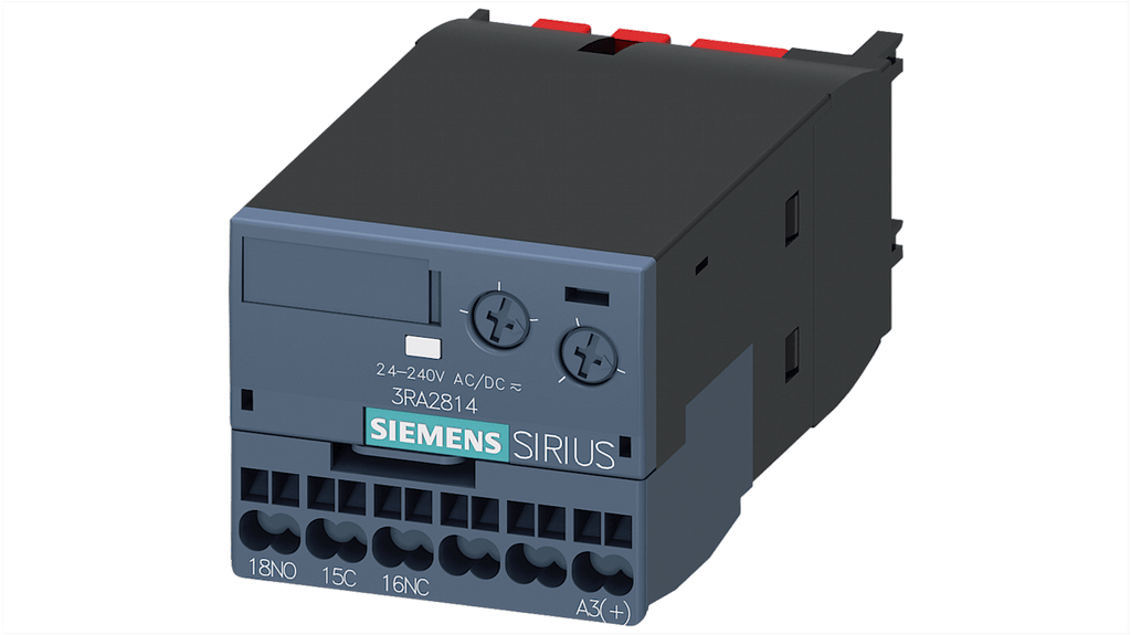 Interruttore ausiliario a stato solido ritardato Siemens, 1 contatto, 1CO, montaggio a clip, compatibile con contattori 3RT2 e 3RH2, morsetto a vite, classe di protezione IP20, approvazione CE, serie 3RA2, range SIRIUS. Codice costruttore 3RA28142AW10.