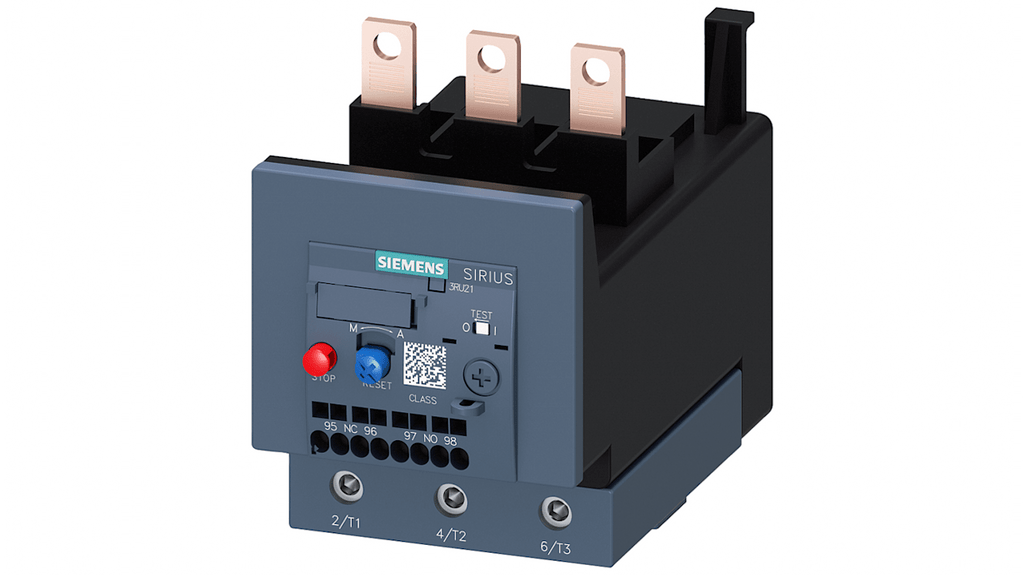Relè di sovraccarico Siemens, protezione motore, carico FLC 50 A, corrente nominale contatto 4 A, configurazione 1NC/1NO, dimensione S3, circuito principale installazione autonoma classe 20E, circuito ausiliario trasformatore passante, reset automatico manuale a vite, resistenza sovratensioni 8 kV, resistenza urti 8 g/11 ms, frequenza funzionamento 50-60 Hz, perdita di potenza 0,2 W.