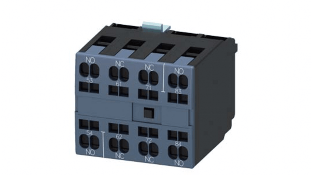 Blocco interruttore ausiliario Siemens, 4 contatti, 2 NO + 2NC, montaggio a innesto, serie 3RH. Terminale a molla, approvazione EAC. Progettato per relè contattore e contattore di potenza. Compatibile con la gamma SIRIUS.