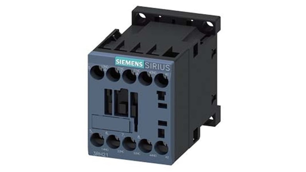 Relè contattore Siemens, serie 3RH2, 4 poli, 2 NO + 2NC, 10 A, bobina 32 V ac, tensione nominale contatto 690 V c.a., durata meccanica 30000000 cicli, montaggio a vite e snap-on su guida DIN 35 mm, protezione IP20, collegamento terminali a vite, resistenza alle sovratensioni 6 kV, dimensione contattore S00, inclinazione +/- 22,5 gradi.