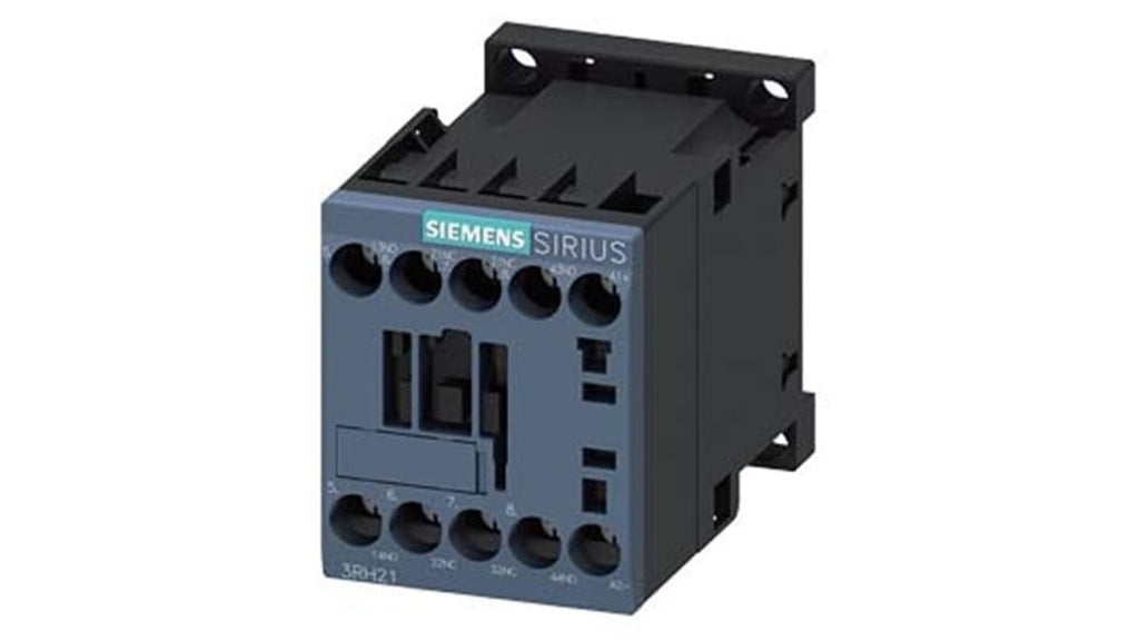 Relè contattore Siemens, serie 3RH2, 4 poli, 2 NO + 2NC, 10 A, bobina 24 V c.c., tensione nominale contatto 690 V c.a., durata meccanica 30000000 cicli, montaggio a vite e snap-on su guida DIN da 35 mm, protezione IP20, collegamento terminali a vite, resistenza alle sovratensioni 6 kV, dimensione contattore S00, inclinazione +/- 22,5 gradi.