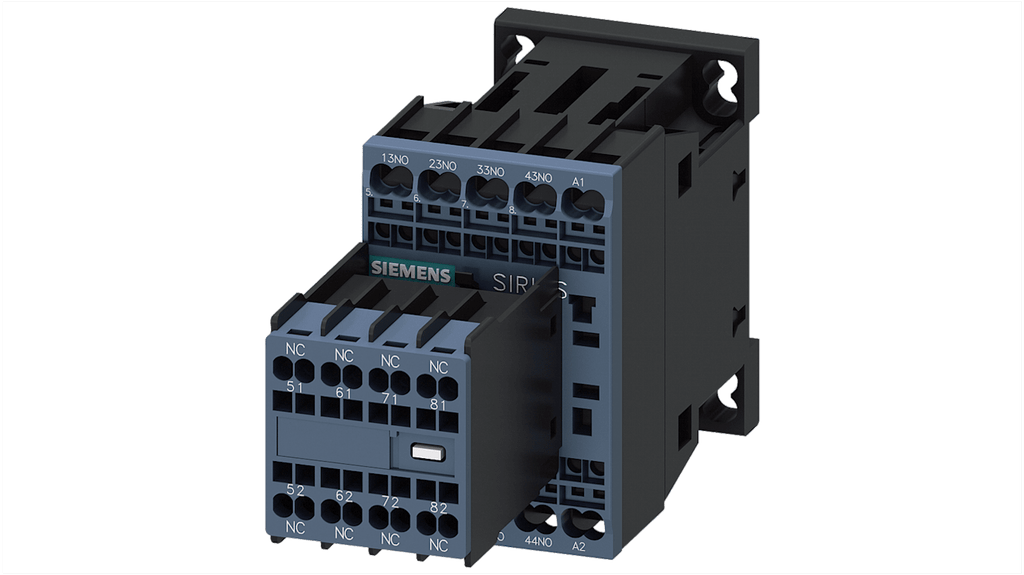 Contattore Siemens per la commutazione dei segnali di controllo, 4NC + 4NO, corrente nominale 3 A, tensione di controllo fino a 110 V c.a., frequenza di funzionamento 50-60 Hz, dimensione S00, interruttore ausiliario rimovibile, collegamento elettrico tramite terminal a molla, grado di protezione IP20, conforme a IEC e UL/CSA.