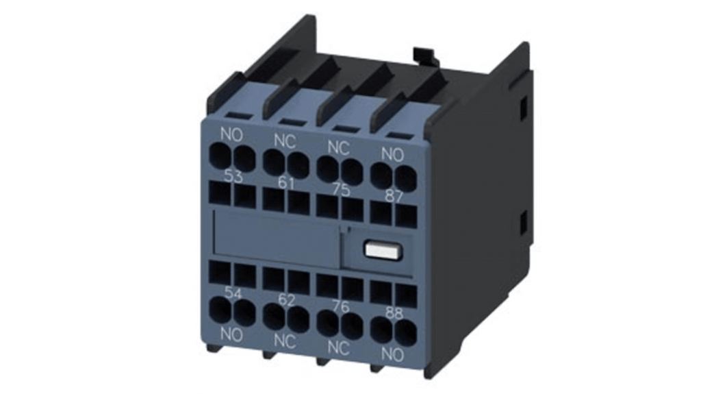 Blocco interruttore ausiliario Siemens, 4 contatti, 2 NA + 2 NC, montaggio a innesto, serie 3RH29, classe di protezione IP20, compatibile con relè contattore e contattore di potenza. Specifiche: numero di contatti 4, configurazione stato normale 2 NA + 2 NC, tipo di montaggio a innesto, range SIRIUS. Codice costruttore 3RH29112FB220MA0.