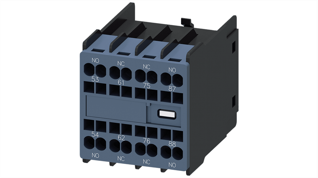 Blocco interruttore ausiliario Siemens, 4 contatti, 2 NA + 2 NC, montaggio a innesto, serie 3RH2. Terminale a molla, approvazione EAC. Prodotto compatibile con relè contattore e contattore di potenza. Specifiche: numero di contatti 4, configurazione stato normale 2 NA + 2 NC, tipo di montaggio montaggio a innesto.