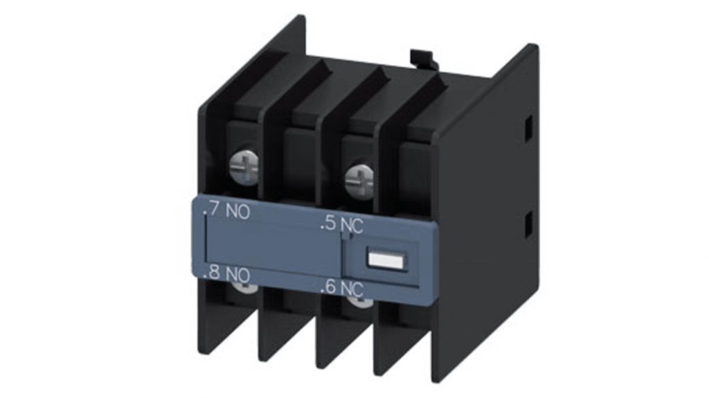 Blocco interruttore ausiliario Siemens, 2 contatti, 1 NA + 1 NC, montaggio a innesto, serie 3RH29. Collegamento a innesto per cavo ad anello, approvazione EAC. Adatto per relè contattore e contattore di potenza. Specifiche: numero di contatti 2, configurazione stato normale 1 NA + 1 NC, tipo di montaggio a innesto. Codice costruttore 3RH29114FB11.