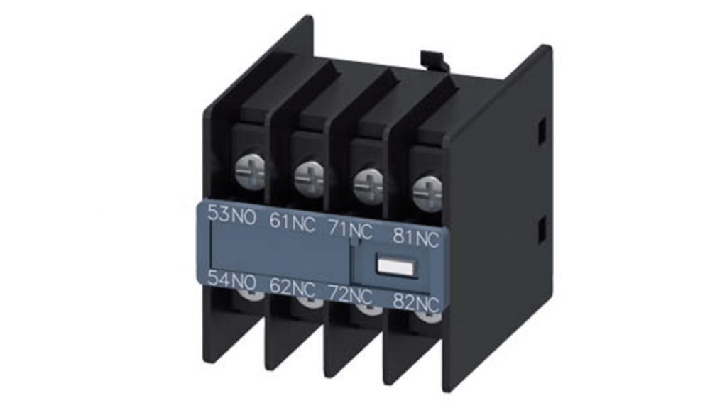 Blocco interruttore ausiliario Siemens, 4 contatti, 1 NA + 3 NC, montaggio a innesto, serie 3RH2. Collegamento a innesto per cavo ad anello, approvazione EAC. Prodotto adatto per relè contattore e contattore di potenza. Codice costruttore 3RH29114GA13.