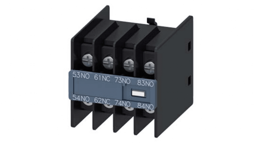Blocco interruttore ausiliario Siemens, 4 contatti, 3 NA + 1 NC, montaggio a innesto, compatibile con relè contattore e contattore di potenza, collegamento a innesto per cavo ad anello, approvazione EAC, serie 3RH29, range SIRIUS. Codice costruttore 3RH29114GA31.