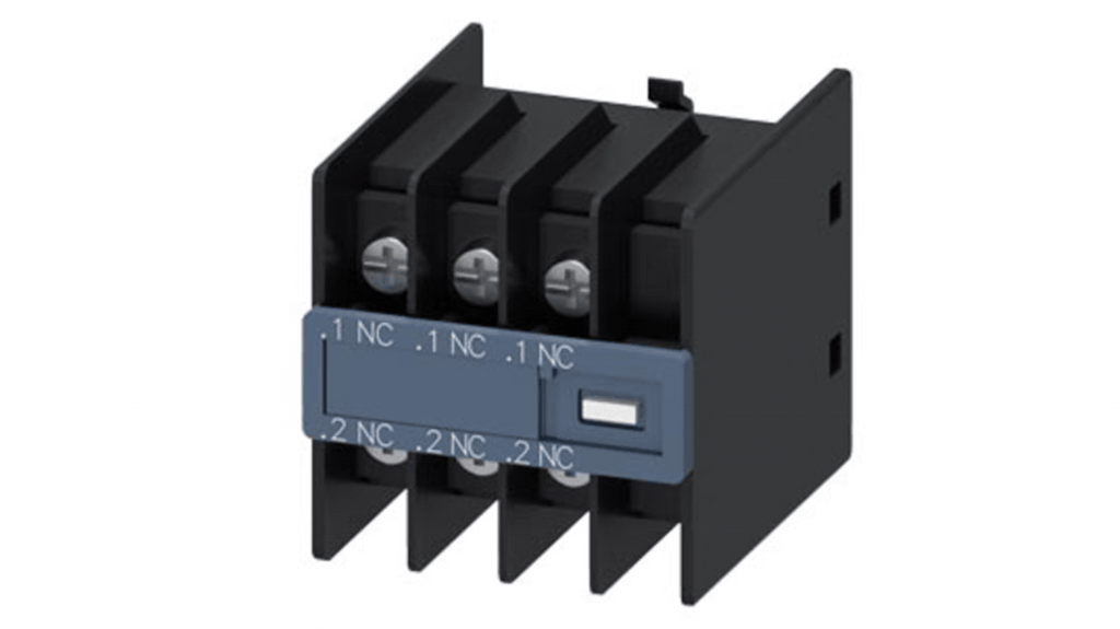 Blocco interruttore ausiliario Siemens, 3 contatti, 3NC, montaggio a innesto, serie 3RH2, collegamento a innesto per cavo ad anello, approvazione EAC, compatibile con relè contattore e contattore di potenza. Specifiche: numero di contatti 3, configurazione stato normale 3NC, tipo di montaggio montaggio a innesto, range SIRIUS. Codice costruttore 3RH29114HA03.