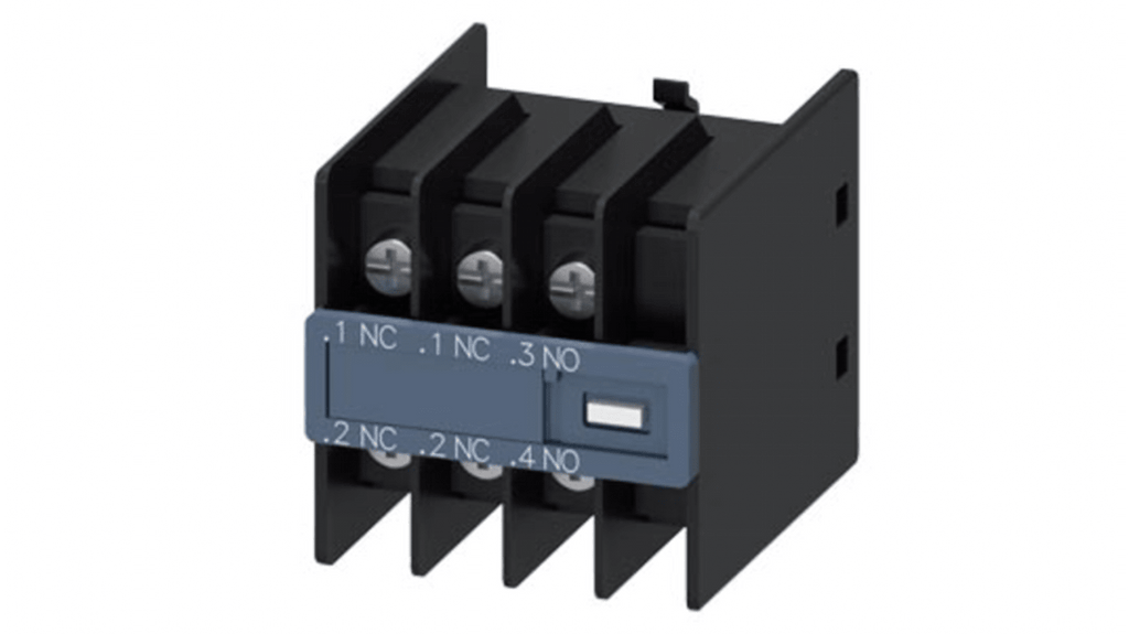 Blocco interruttore ausiliario Siemens, 3 contatti, 1NO + 2NC, montaggio a innesto, serie 3RH2. Collegamento a innesto per cavo ad anello, approvazione EAC. Specifiche: numero di contatti 3, configurazione stato normale 1NO + 2NC, tipo di montaggio montaggio a innesto, range SIRIUS, serie 3RH2.