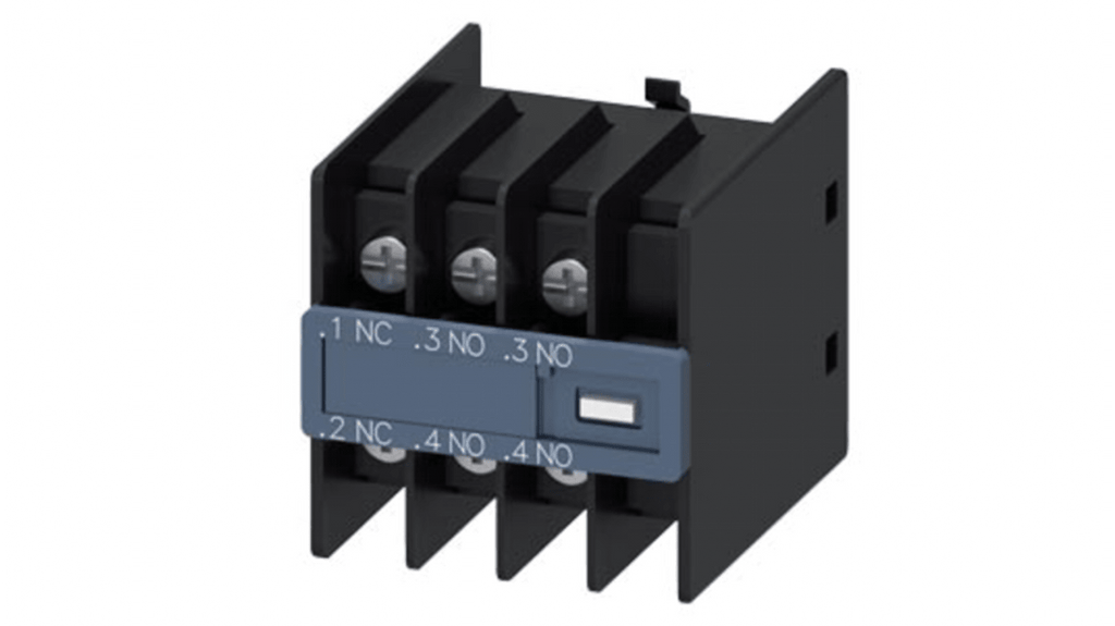 Blocco interruttore ausiliario Siemens, 3 contatti, 2NA + 1NC, montaggio a innesto, serie 3RH2. Collegamento a innesto per cavo ad anello, approvazione EAC. Prodotto adatto per relè contattore e contattore di potenza. Codice costruttore 3RH29114HA21.