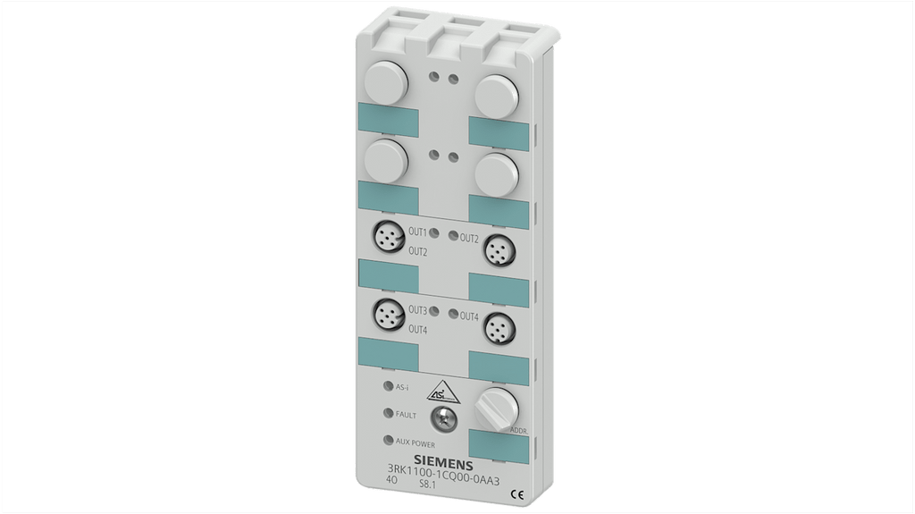 Modulo I/O digitale per PLC, compatibile AS-i, grado di protezione IP67, 4 uscite digitali, corrente massima 4 A per uscita, connessione tramite 4 prese M12, piastra di montaggio da ordinare separatamente. Prodotto Siemens, codice 3RK1100-1CQ00-0AA3, progettato per moduli I/O digitali IP67 – K60.