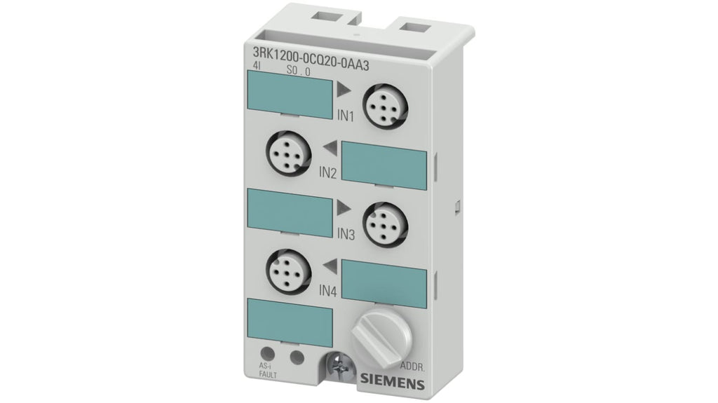 Adattatore AS-I Siemens, modulo di ingresso con 4 ingressi, compatibile con rete AS-I, gestisce la trasmissione dati da sensori e attuatori a protocolli superiori come PROFIBUS e PROFINET. Dimensioni 80 x 45 x 35 mm, con segnali LED per monitoraggio stato, connettori femmina M12 per collegamento sensori, indirizzi assegnabili in montaggio. Codice costruttore 3RK1200-0CQ20-0AA3.