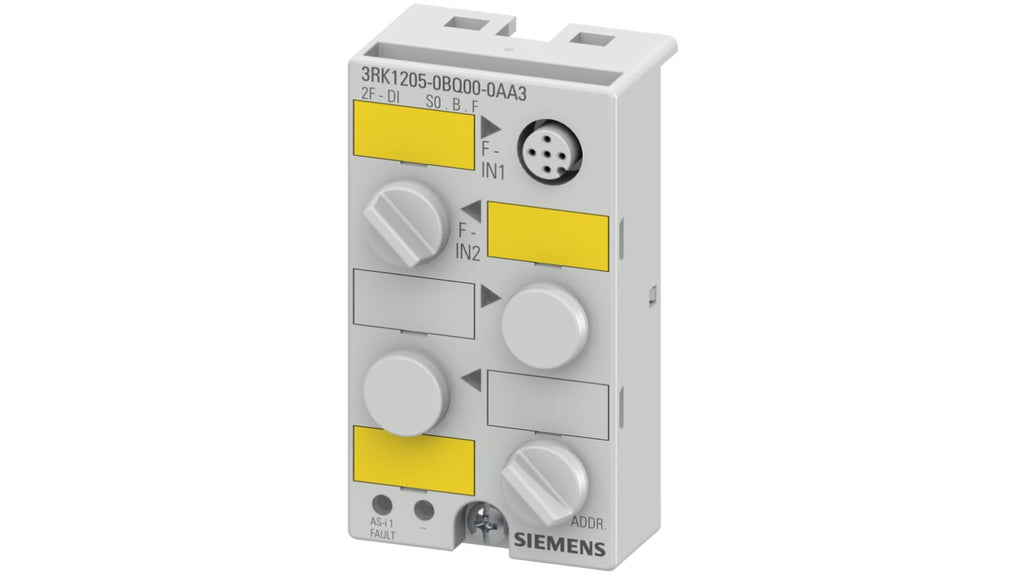 Modulo I/O PLC digitale per rilevamento sicuro di dispositivi meccanici, compatibile con dispositivi di sicurezza a norma EN 954-1. Due ingressi di sicurezza, circuito d'ingresso PNP, design compatto, dimensioni 80x45x35 mm, grado di protezione IP67, massima temperatura operativa +70°C, indicazione LED, 2 connettori femmina di ingresso/uscita. Modulo sicuro AS-I. Codice costruttore 3RK1205-0BQ00-0AA3. Marchio Siemens.