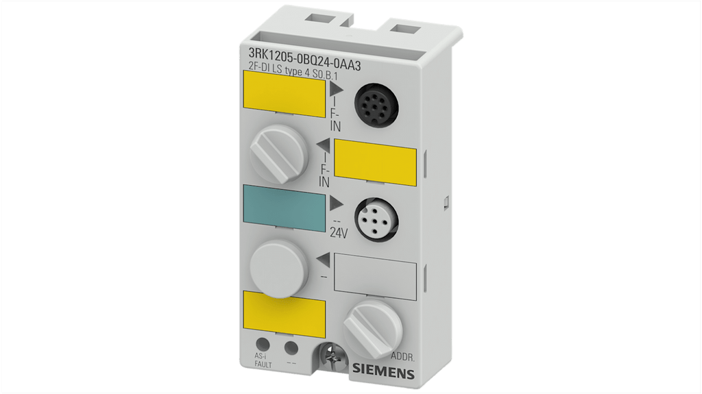 Modulo di monitoraggio digitale per Modulo compatto ASIsafe. Serie 3RK1205, progettato per testare l'uscita dei semiconduttori. Ingressi con coppia di sensori a due canali fino alla categoria di sicurezza. Approvazione EAC, approvazione CE. Dimensioni 80 x 45 x 34 mm.