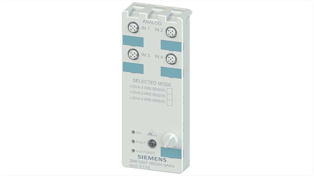Modulo I/O PLC Siemens, compatto AS-i K60 analogico, 4 ingressi, corrente 4-20 mA, +/- 20 mA per sensori a 4 fili, grado di protezione IP67, piastra di montaggio per connettore femmina M12 da ordinare separatamente. Specifiche: modulo I/O analogico, tipo accessori, range AS-I.