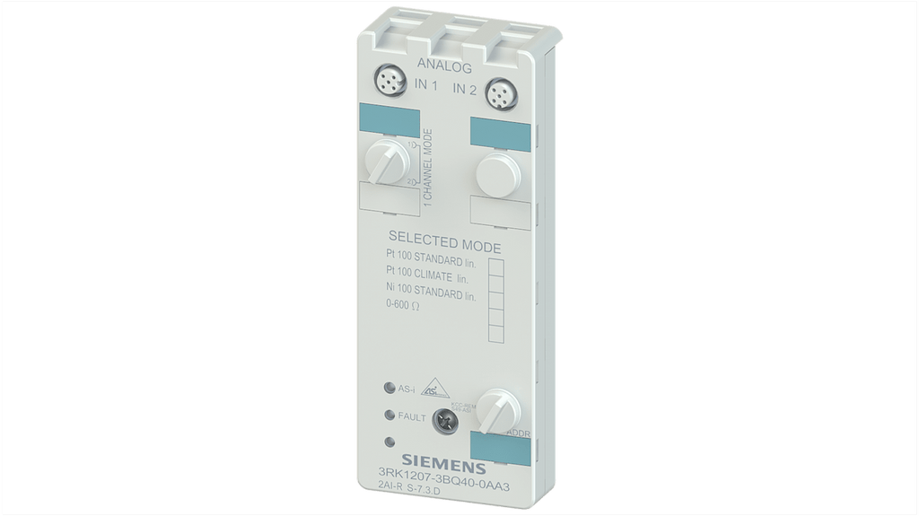 Modulo I/O PLC Siemens, compatto AS-i K60 analogico 2 ai, grado di protezione IP67, 2 ingressi, compatibile con resistori Pt100 e Ni100, 0,600 ohm per sensori a 4 fili, piastra di montaggio per connettore femmina M12 da ordinare separatamente. Specifiche: modulo I/O analogico, tipo accessori, range AS-I.