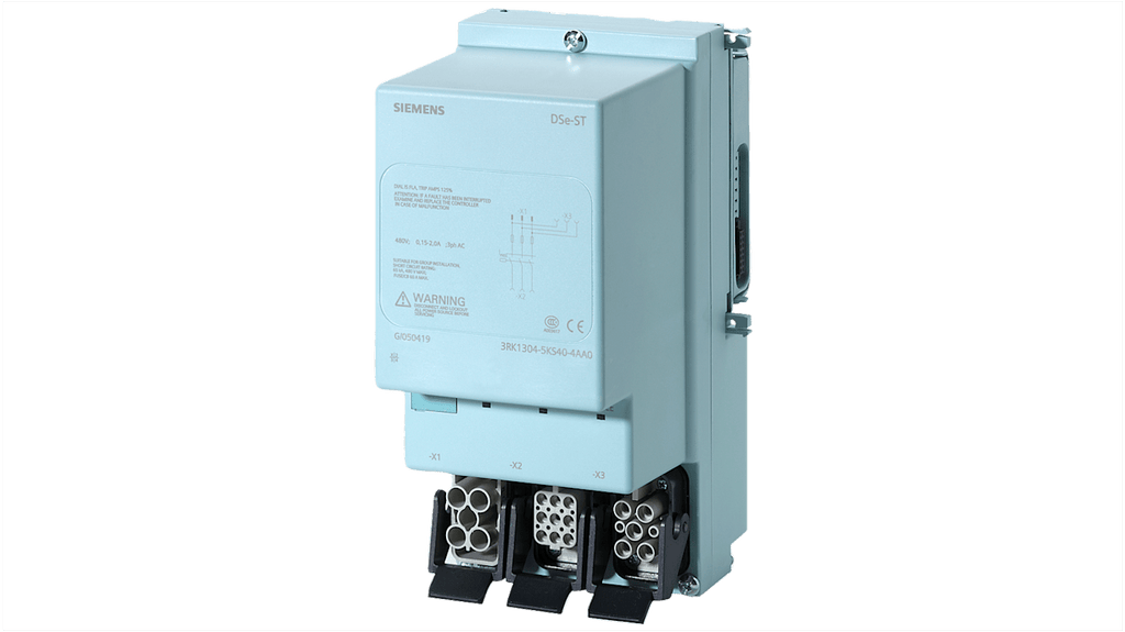 Starter per motore manuale Siemens, potenza nominale 0,9 kW, tensione nominale 400 V c.a., corrente nominale 2 A, grado di protezione IP65, contatto di commutazione elettromeccanico, protezione contro sovraccarichi elettronici, progettato per ET 200pro, range di tensione d'esercizio da 200 V a 400 V, numero di poli 3P. Codice costruttore 3RK1304-5KS40-4AA3.