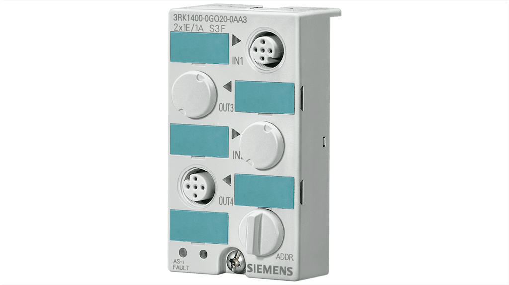 Modulo I/O PLC digitale compatto, Siemens 3RK1400-0GQ20-0AA3, 2 ingressi digitali/uscite, grado di protezione IP67, protezione cortocircuiti incorporata, watchdog integrato, connettori femmina M12, compatibile con piastra di montaggio U_ASI 3RK1901-2EA00 o 3RK1901-2DA00 da ordinare separatamente. Tipo accessori: modulo I/O digitale K45, range AS-I.