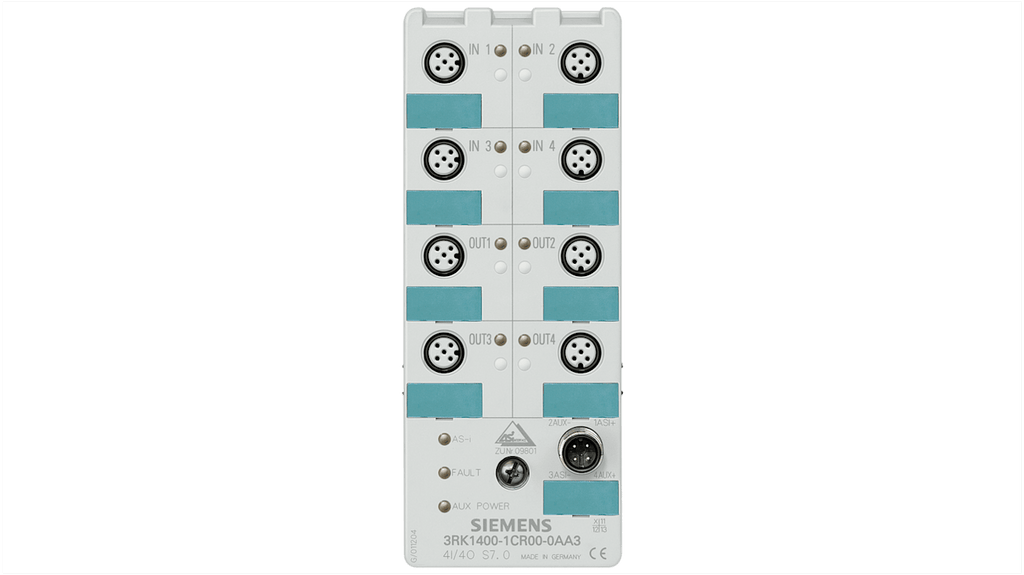 Modulo I/O PLC digitale compatto. 4 ingressi digitali, 4 uscite digitali, corrente massima 200 mA per ingresso, 4 A per uscita. Grado di protezione IP68, protezione cortocircuiti incorporata, watchdog integrato. Compatibile con AS-i, montaggio con piastra di connettori femmina da ordinare separatamente. Codice costruttore 3RK1400-1CR00-0AA3, marchio Siemens.