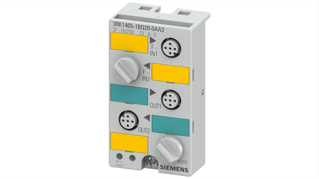 Modulo di ingresso/uscita compatto ASIsafe. Tensione di alimentazione 24 V, 2 ingressi F-DI, 2 uscite DQ, grado di protezione IP67. Sicurezza digitale K45F, protezione contro i cortocircuiti incorporata, watchdog integrato. Richiede connettore femmina M12 per montaggio. Codice costruttore 3RK1405-1BQ20-0AA3, marchio Siemens.