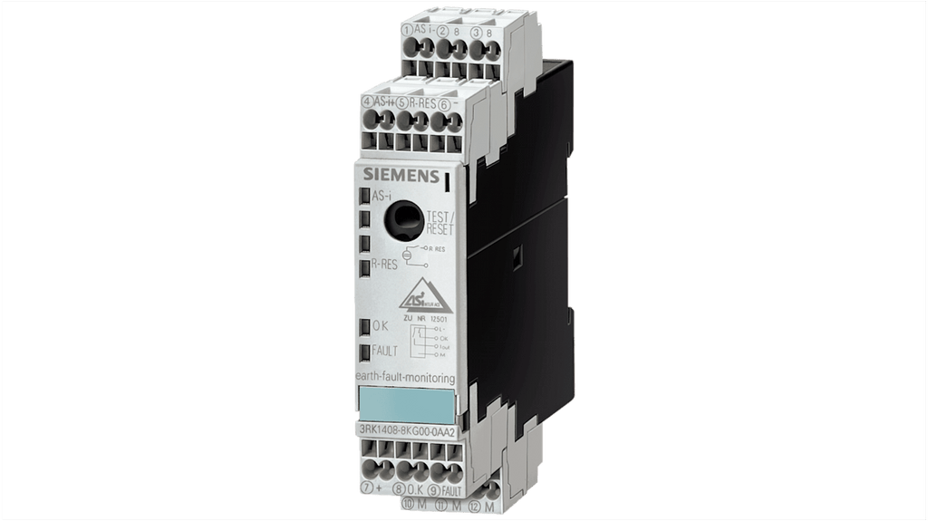 Modulo di guasto di messa a terra AS-i, ingresso monitoraggio guasti 1, uscite di segnalazione per reset remoto 2, corrente nominale 500 mA, tensione di alimentazione 24 V, grado di protezione IP20, larghezza totale 22,5 mm, terminale a molla del relè, senza indirizzo AS-i richiesto, progettato per il monitoraggio della potenza del motore.