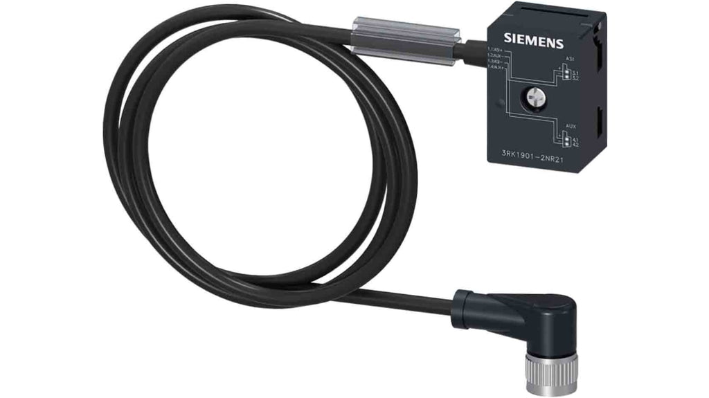 Modulo di interfaccia per transizione del cavo piatto a M12, Siemens 3RK1901-2NR21, cavo AS-Interface M12 diramazione U_ASI e Uaux, lunghezza 1 m, connettore femmina M12 ad angolo, grado di protezione IP67/68/69K, compatibile con accessori interfaccia, progettato per uso industriale.